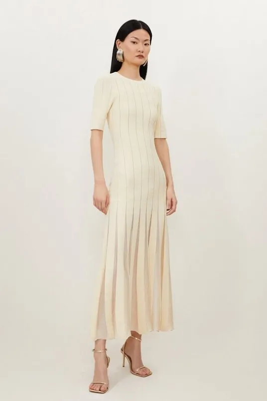 Prepare to turn heads in our midi dress, with a bodycon fit through the hips, which flows to a flared skirt with sheer stripe detailing. Style it with sparkly heels and a matching clutch bag for an occasion look that fills you with immeasurable confidence.Viscose Blend Filament Full Skirt Knit Midi DressHigh Quality Knit FabricSheer, Striped SkirtFigure Hugging Fit Through HipsHigh NecklineFit and Flare SilhouetteCasual, Short SleevesDetails & Care55% Viscose 43% Polyamide 2% Elastane. Wash with similar colours. Model wears UK Small. Small centre back length approx: 125cm