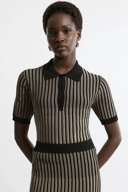 Elevate your daytime wardrobe with our classic polo top, with a slinky silhouette. The top features a short sleeved, polo shirt style design and stripe detailing for a contrasting colour palette. Style it with the matching skirt and ankle boots or chunky loafers for an autumnal day to night look.Viscose Blend Jacquard Knit Polo TopHigh Quality Knit FabricStatement Stripe PatternShort SleevesFigure Hugging SilhouetteButton Detailing at NecklineMatching Skirt Sold SeparatelyDetails & Care70% Viscose/Rayon, 30% Nylon. Remove promptly from washing machine. Reshape whilst damp. Dry flat. Model wears size s. Model height 5″9. Item length 52cm