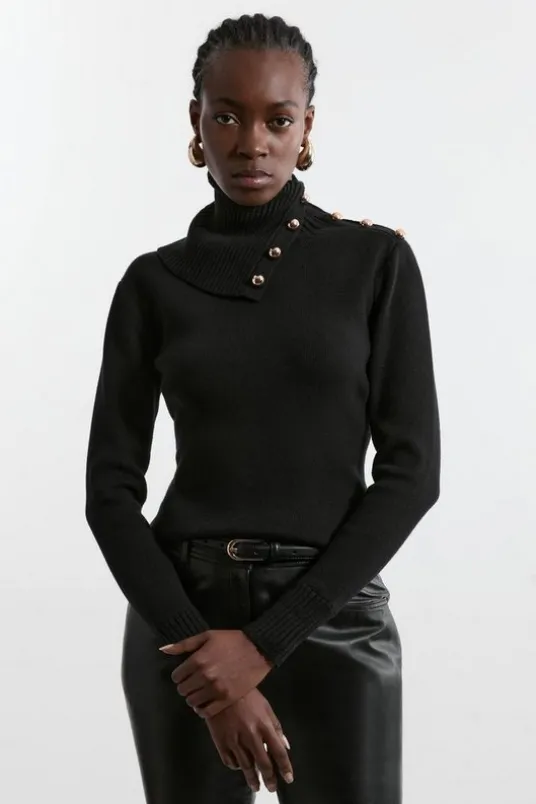 Distinctive envelope neck design with military-inspired button detailingRibbed texture for added visual interest and warmthSleek side buckle accents for a tailored silhouetteLong sleeves with ribbed cuffs for a polished finishVersatile knit fabric suitable for various occasionsThis sophisticated jumper seamlessly blends military-inspired elements with contemporary elegance. The unique envelope neck, adorned with gleaming buttons, creates a striking focal point that draws the eye. The ribbed texture not only adds visual depth but also ensures warmth and comfort. For a day of errands or a casual lunch date, pair this jumper with tailored trousers and ankle boots. The side buckle accents offer a flattering cinched effect, perfect for showcasing your silhouette. Transition effortlessly from day to evening by swapping your daytime accessories for statement earrings and a clutch bag. This versatile piece is ideal for those seeking a polished yet relaxed look, embodying the Karen Millen ethos of sophisticated style with a modern twist.Details & Care52% viscose/rayon, 28% polyester, 205 polyamide. 30 degrees wool cycle. model wears a Small.