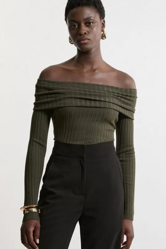 Elevate your every day wardrobe with a knit jumper, which features a bodycon fit that highlights the curves, and a statement, foldover bardot neckline which elevates the formality. Style it with tailored trousers or jeans and strappy heels for a day to night look that is guaranteed to turn heads wherever you step.Viscose Blend Bardot Knit JumperHigh Quality, Soft Knit FabricFormal Bardot NecklineFold Over AccentLong SleevesBodycon SilhouetteSubtle Stripe DetailingDetails & Care70% viscose, 30% nylon. 30 degrees wool cycle. model wears a Small.