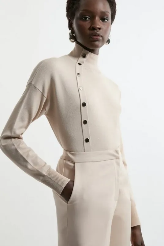 Elegance exudes from this softly knit sweater, featuring a high ribbed neck with silver-toned polished button detailing that cascades to a ribbed hem. Pair with a maxi skirt or tailored pants for a sophisticated and casual wear.ViscoseHigh neckButton detailingDetails & CareMain: 70% Viscose, 30% Nylon. 30 degree wool cycle. Model wears a UK size Small. Models height approx: 5″9. Length approx: 60cm.