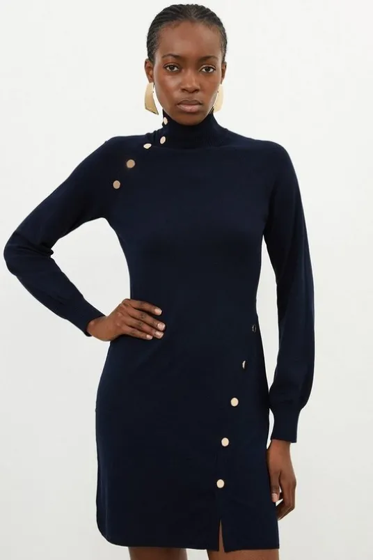 This fashionable and versatile knitted mini dress is the perfect addition to your cold-weather closet. Made from a soft and comfortable wool blend, this piece features a modern popper detail at the front, slightly flared long sleeves, and a flattering high turtle neckline.Knitted dressLong sleevesTurtle neckPopper buttonsMini hemlineDetails & Care72% viscose/rayon 28% polyamide. 30 degree wool cycle.. Model wears UK size small. Model height Approx: 5″9. Small centre back length approx 90cm.