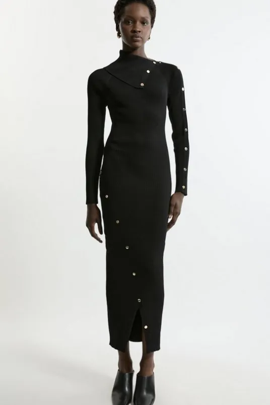 Get dressed up in our midi dress, which features a bodycon silhouette which accentuates the curves, and an envelope neckline, certain to catch eyes. Pair this piece with court heels or strappy heels for looks that go seamlessly from office days to occasions and events.Viscose Blend Rib Envelope Neck Knit Midi DressHigh Quality, Stretchy Viscose FabricUnique Envelope NecklineFigure Hugging FitMidi LengthBodycon SilhouetteMetallic Hardware DetailingDetails & Care53% polyamide, 47% viscose/rayon. 30 degrees cotton cycle. model wears a Small. models height is 5″7. centre back length is 128cm.