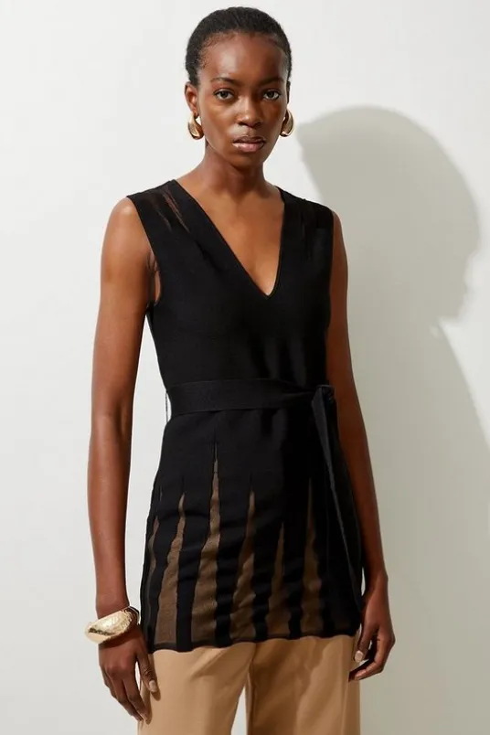 Elevate your every day wardrobe in our tunic top, with a fitted silhouette that flares to a soft peplum, made in soft, knit fabric. The sheer detailing makes for a dynamic top option. Style it with tailored trousers or jeans and strappy heels for an elevated day to night look.Viscose Blend Sheer Detail Belted Knit TunicHigh Quality, Soft Knit FabricFlattering Flared SilhouetteLongline Design Deep V Neckline Sheer V Panel in Back Belted Waistline Sheer Detailing in PleatsDetails & Care65% recycled viscose, 35% polyamide. Cool hand wash only, do not tumble dry, cool iron, do not dry clean. Model wears a UK S, center back length app 85cm.