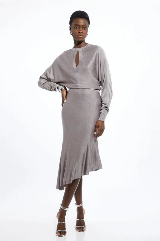Viscose Blend Slinky Jacquard Asymmetric Knit Midi Dress