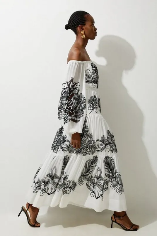 Feel summer ready in our beach maxi dress, which features an ultra relaxed fit, and off shoulder sleeves, perfect for long walks from the beach to the tapas bar. Style it with sandals for a look ideal for upcoming hot days and holidays.Viscose Georgette Placed Cutwork Bardot Woven Maxi DressHigh Quality Georgette FabricUnique Cutwork DetailingStatement Bardot NecklineCinched, Belted WaistlineRelaxed, Straight Hanging DesignVoluminous Balloon SleevesDetails & CareShell: 100% Polyester. Lining: 100% Polyester. Dry clean only. Model Height 5”10 – Model wears a UK 8/US Size 6. Centre back length of a size 10: 140cm
