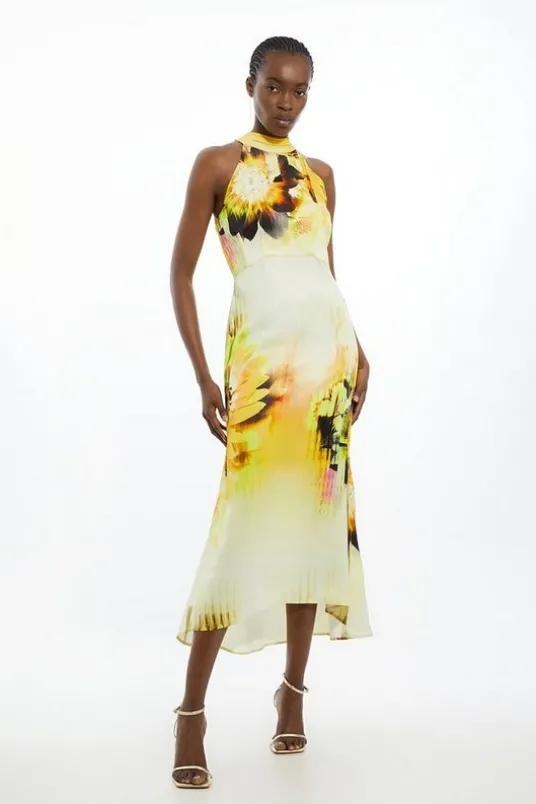 Viscose Satin Tie Dye Floral Halter Midi Dress