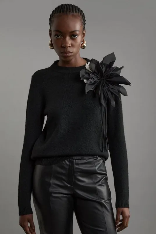 Experience elevated daytime dressing our knit jumper, made with the highest quality cashmere wool, featuring a relaxed silhouette, with a statement floral accent at the shoulder. Pair this piece with jeans or tailored trousers for looks that go from office days to post-work plans.Wool Blend Cosy Knit Floral Applique JumperHigh Quality Cashmere Wool FabricUniversally Flattering Relaxed SilhouetteFlattering High NecklineStriking Three Dimensional Floral AppliqueDetails & Care76% Recycled Polyester. 15% Nylon. 6% Wool. 3% Elastane/Spandex. Dry flat. Remove promptly from washing machine. Model wears Size S.