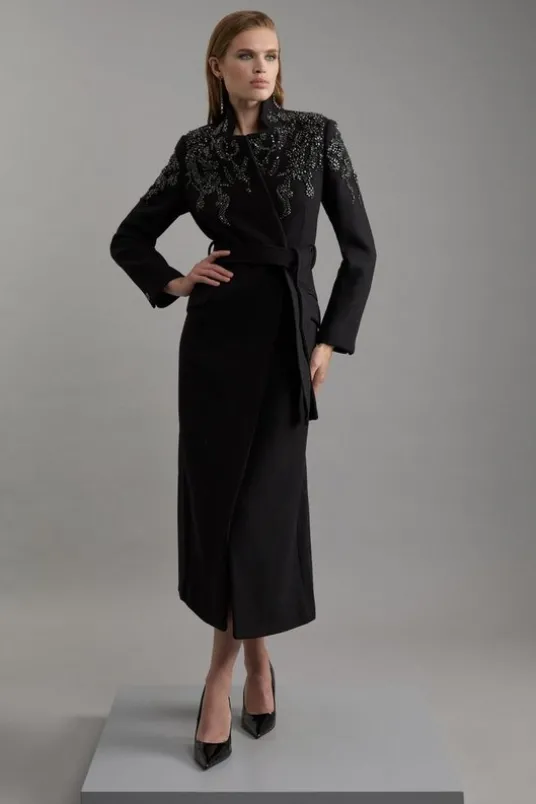 Wool Blend Crystal Embellished Notch Neck Belted Maxi Coat