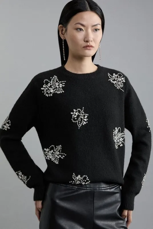 Feel elegant in our knit jumper, with a slouchy silhouette, and sparkling, embellished detailing. Style this piece with jeans or tailored trousers for an outfit that will take you from office days to wintery walks.Wool Blend Embellished Cosy Knit JumperHigh Quality Wool Blend FabricHigh, Round NecklineComfortable, Relaxed SilhouetteSparkling, Embellished DetailingDetails & CareMain: 58% Polyester, 24% Acrylic, 8% Nylon, 8% Wool, 2% Elastane. Hand was only. Model wears UK size Small. Models height approx: 5″9. Length approx: 60cm.