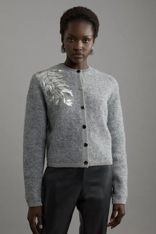Feel elegant in our knit cardigan, with a silhouette that skims the curves, and a sequin leaf embellishment across the shoulder. Style this piece with jeans or tailored trousers for an outfit that will take you from office days to wintery walks.Wool Blend Embellished Sequin Leaf Knit CardiganHigh Quality Wool Blend FabricHigh, Round NecklineComfortable, Relaxed SilhouetteSparkling, Embellished Sequin Detailing at ShoulderButton Front FasteningsDetails & Care75% recycled polyester, 8% nylon, 6% wool, 1% elastane/spandex. cool hand wash only. model wears a Small.