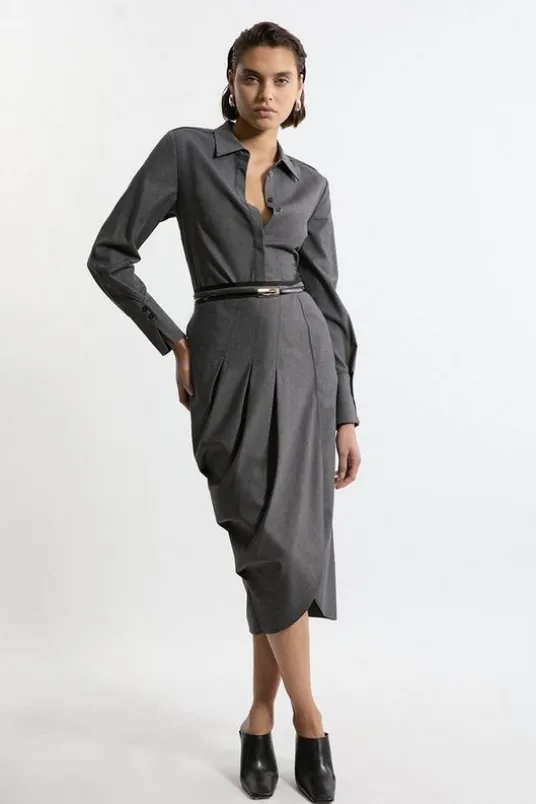 Wool Blend Pleated Detail Tailored Midi Skirt