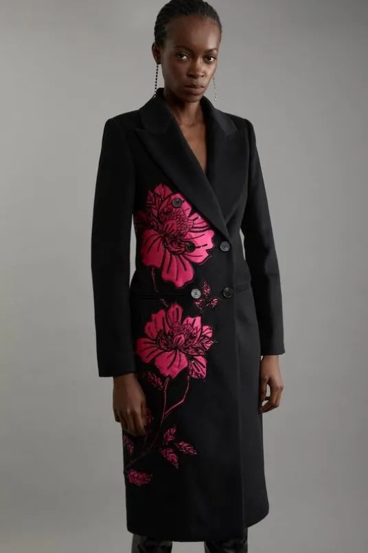 Wool Blend Satin Applique Embellished Double Breasted Tailored Midi Coat
