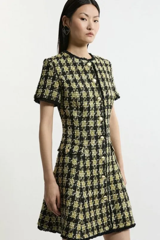 Embrace a preppy aesthetic in this check boucle mini dress. Featuring a bandeau neckline and a checky design, this mini dress can be easily styled for daytime plans. Pair it with boots and a leather jacket for an elegant everyday outfit, or elevate for the evening with heels and clutch bag.Wool Mix Boucle Check Tailored Mini DressMini HemlineWool Blend BoucleCheck DesignFront PocketsShort SleevesDetails & Caremain 59% acrylic, 28% polyester, 10% wool, 3% other fibres. Model wears UK10/US6. Model height 5″9. Length approx 89cm